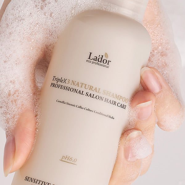 Shampoing hypoallergénique au pH légèrement acide, le TripleX 3 Natural Shampoo de La'dor élimine en douceur les pellicules et les impuretés sans irriter le cuir chevelu.