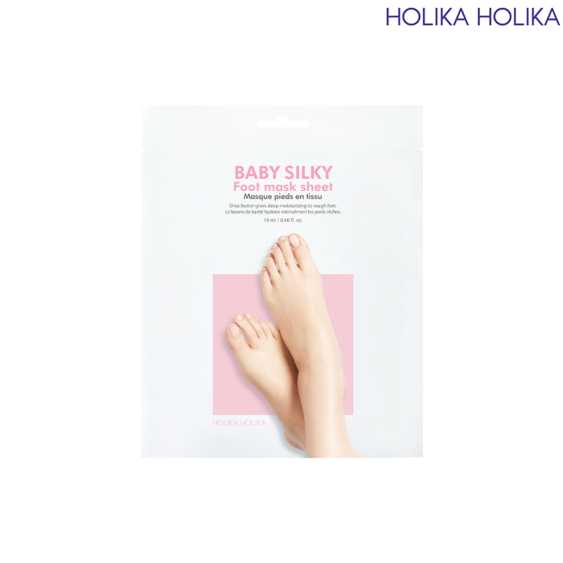 Enrichi en acides de fruits et en huiles végétales, le Baby Silky Foot Mask Sheet de Holika Holika va débarrasser la peau des pieds des cellules mortes tout en les nourrissant.