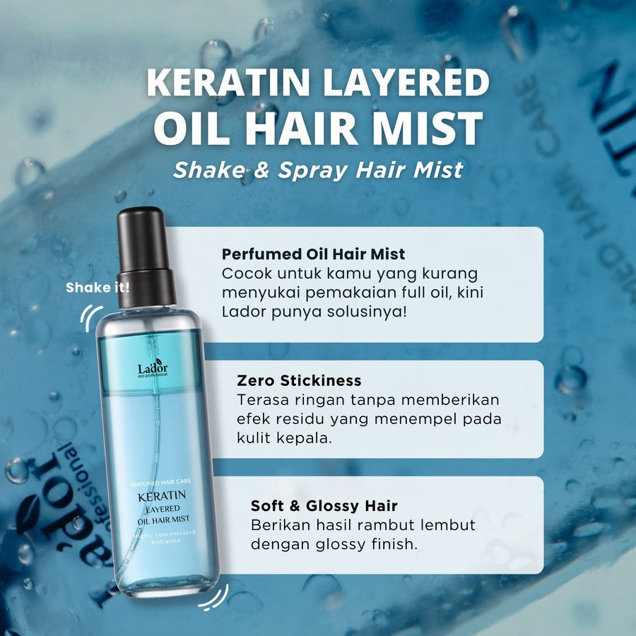 La Keratin Layered Oil Mist de La’dor est une brume capillaire enrichie de 10 extraits végétaux, de kératine, d'huile d'avocat et d'huile de noyau d'Argania Spinosa qui apporte hydratation et nutrition aux cheveux secs avec un subtil parfum d'Osmanthus.