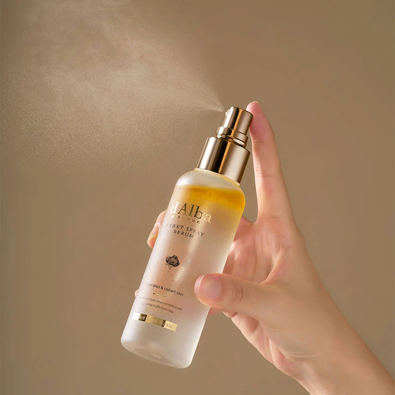 Sérum en brume végane, à la formule bi-phasée unique (huile et sérum), le White Truffle First Spray Serum de d'Alba offre une hydratation profonde et un effet raffermissant immédiat.