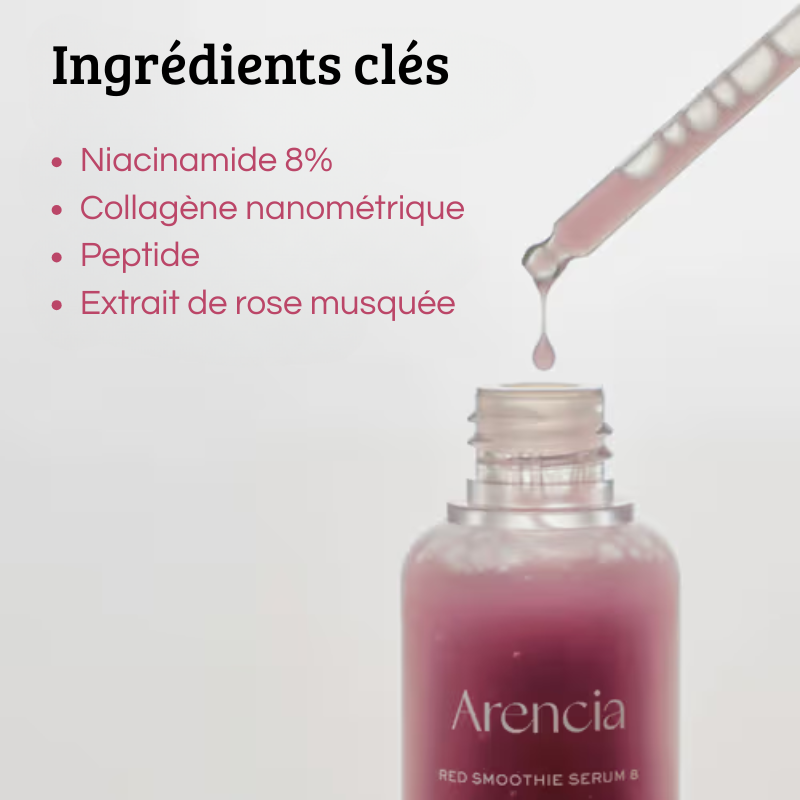 Contenant 8% de niacinamide, de la vitamine C, différents dérivés de vitamine C et du nano-collagène, le Fresh Red Smoothie Serum 8 de Arencia contribue à unifier le teint et à lisser la texture de la peau.