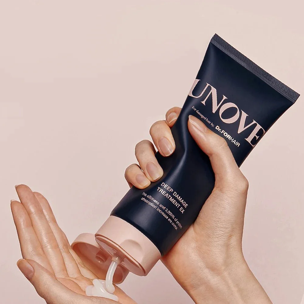 Traitement intensif pour cheveux abîmés, le Deep Damage Treatment EX de Unove contient 80 % de protéines de kératine, des acides aminés et des huiles végétales pour redonner à la fibre capillaires son aspect souple et brillant.