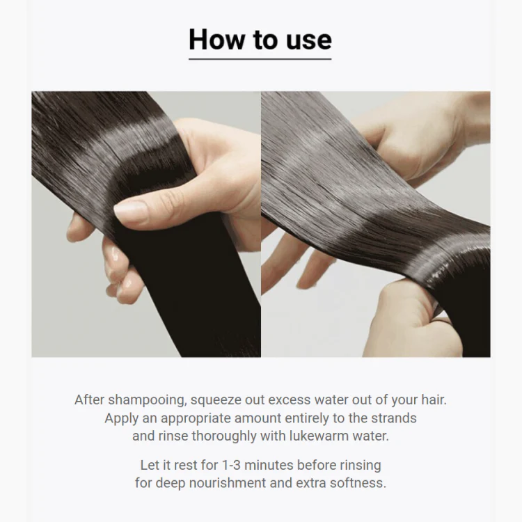 Après le shampooing, essorer l'excès d'eau de les cheveux. Appliquer une quantité appropriée sur les pointes et rincer abondamment à l'eau tiède.