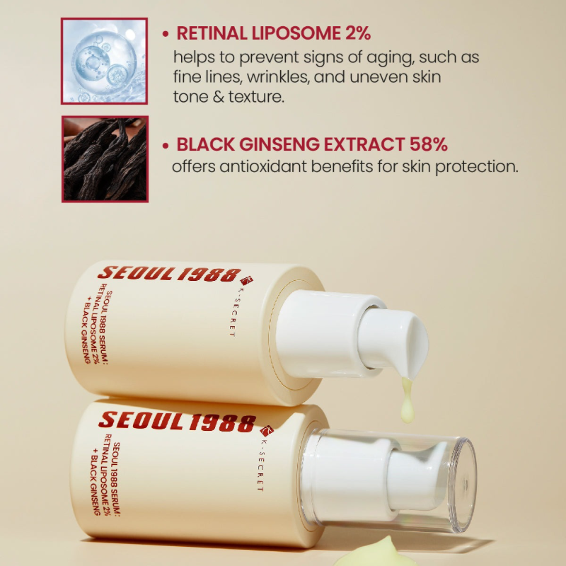 Prix unitaire / parLe Seoul 1988 Serum de KSECRET est un sérum anti-âge enrichi de 2 % de retinal liposomal (0,02% de retinal pur) et de ginseng noir qui favorisent le renouvellement cellulaire pour un teint plus jeune et radieux, une texture de peau plus lisse et des rides estompées.